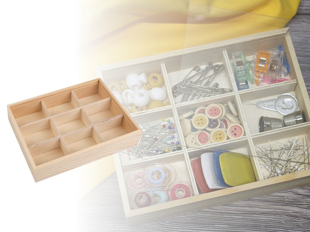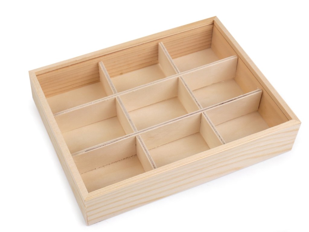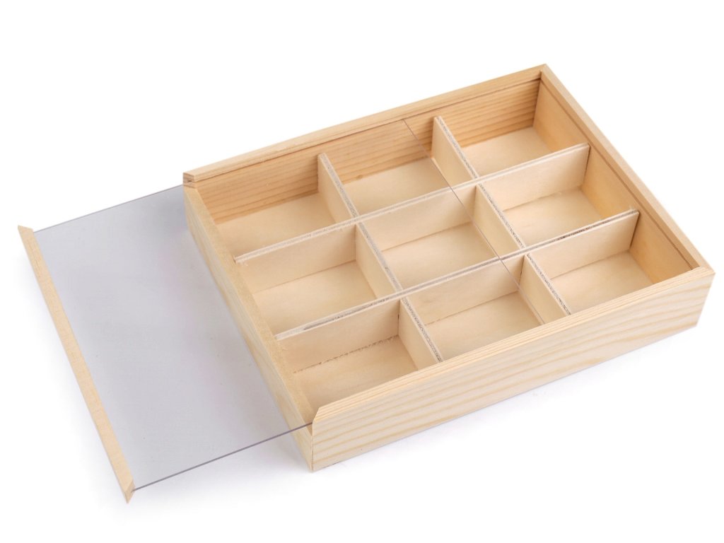 Do dřevěné krabičky se zasouvacím průhledným víkem můžete uložit drobný materiál na vaše kreativní tvoření. Hodí se na korálky, knoflíky, bižuterní materiál a pod. Najde využití i jako organizér v domácnosti, do skříně, zásuvky a pod. Přihrádky lze odejmout. Velkou výhodou je, že si krabičku můžete dozdobit dle svého vkusu. Rozměry složených přihrádek jsou cca 4 x 5 cm.