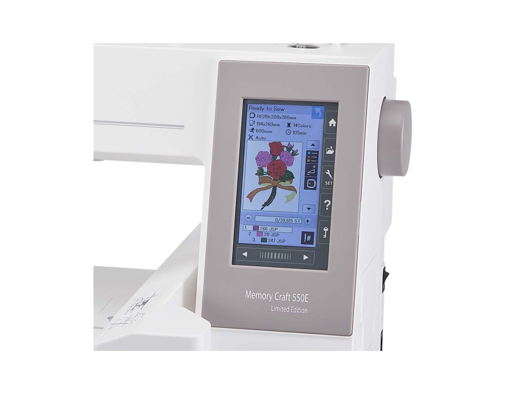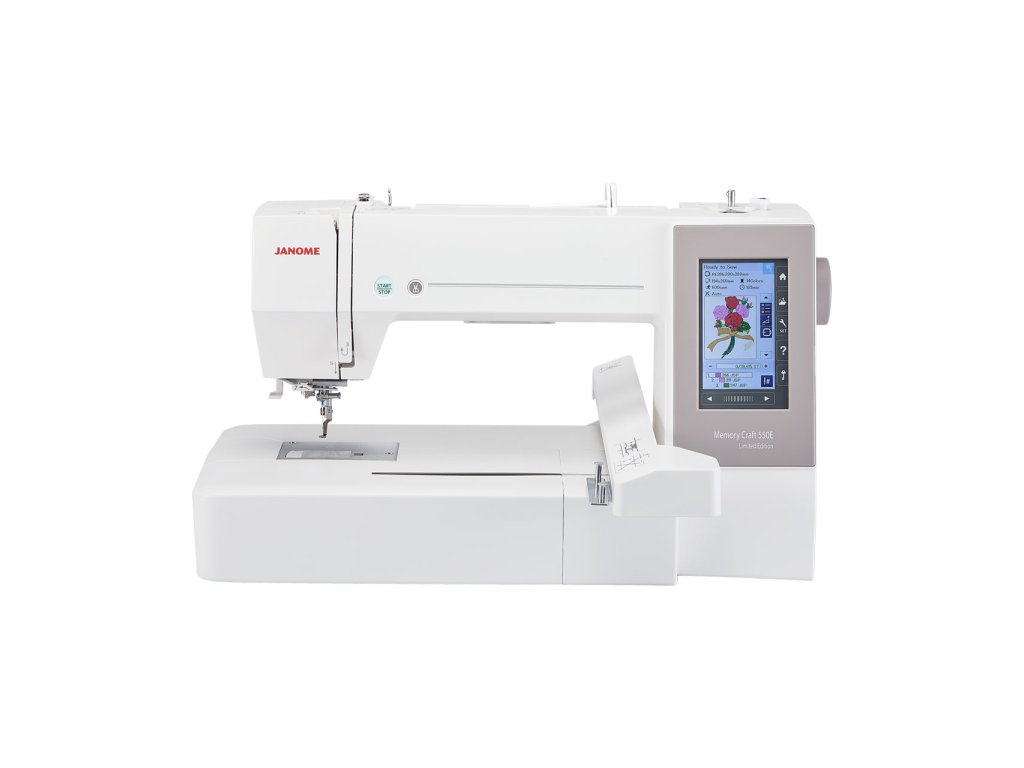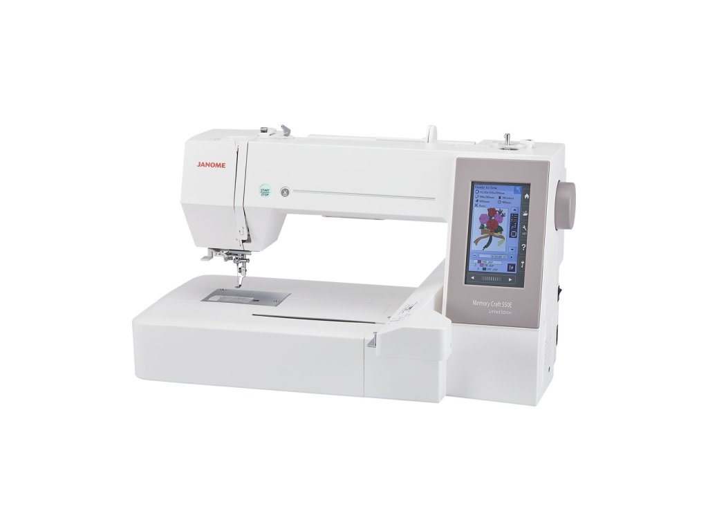 Elektronické vyšívací stroje Janome MC550E Limited Edition jsou řízeny počítačem a jsou určeny výhradně k vyšívání. Tyto stroje jsou vybaveny rotačním chapačem, automatickým navlékáním nitě, intuitivním barevným LCD displejem a USB připojením k PC. Vyšívací stroje MC550E LE nabízejí kvalitu šití příznačnou pro stroje Janome, včetně vynikajících vyšívacích funkcí. Oproti modelu MC500E má tento model o 20 více zabudovaných vzorů a větší vyšívací plochu 200 x 360 mm (oproti 200 x 280 mm).