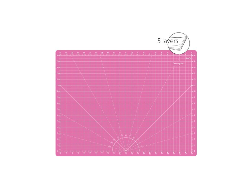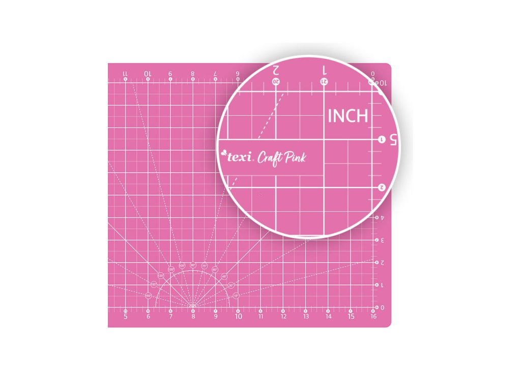Podložka s vyznačenými úhly a rovnoběžnými čarami, značení v cm/inch, tloušťka podložky 3 mm, velikost 45 x 30 cm, barva růžová.
