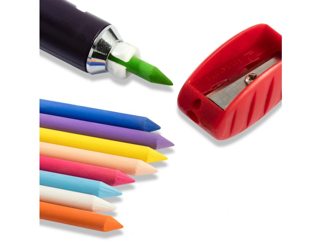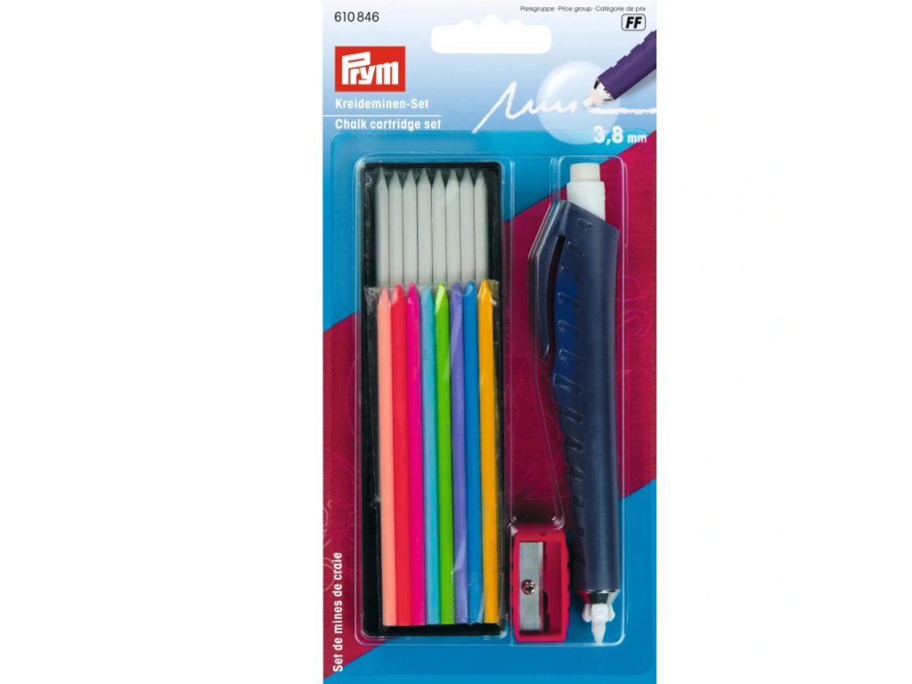 Křídová souprava Prym je vhodná pro kreslení, psaní a značení téměř na všechny povrchy. Je ideální pro ruční práce a koníčky jako šití, prošívání, ruční práce a modelování. Nejen přesné čárové značení, ale také bodové značení lze rychle a přesně realizovat pomocí doplnitelného držáku. Na horním konci držáku elektrody je tlačítko s gumičkou, jejíž přidržovací mechanismus uvolní elektrodu, když ji stisknete a vyměníte. Součástí dodávky je 8 bílých a 8 barevných tuží, držák na křídové tuhy a speciální bruska na křídové tuhy.