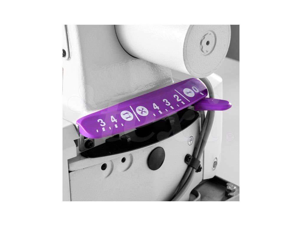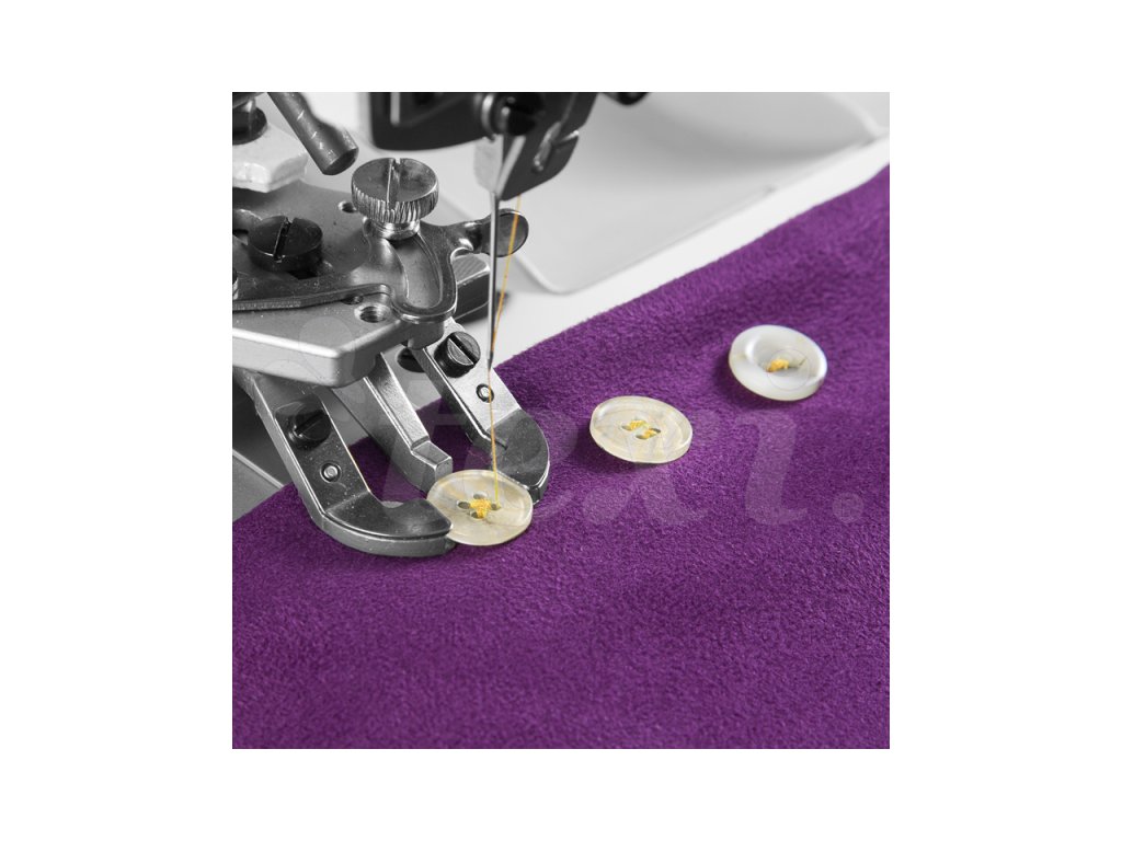 1-jehlový knoflíkovací stroj se zabudovaným servomotorem v hlavě stroje a ovládacím LCD panelem na desce stolu. Stroj šije řetízkovým stehem, součástí je odstřih nitě, může přišívat 2 a 4-dírkové knoflíky do kříže rozměru od 10 do 28 mm. Stroj je osazen standardně držákem pro přišívání plochých knoflíků. V případě, že máte zájem přišívat knoflíky s krčkem, musíte dokoupit držák B2401-373-0B0. Rozměry děr knoflíků 2.5 - 6.5 mm.